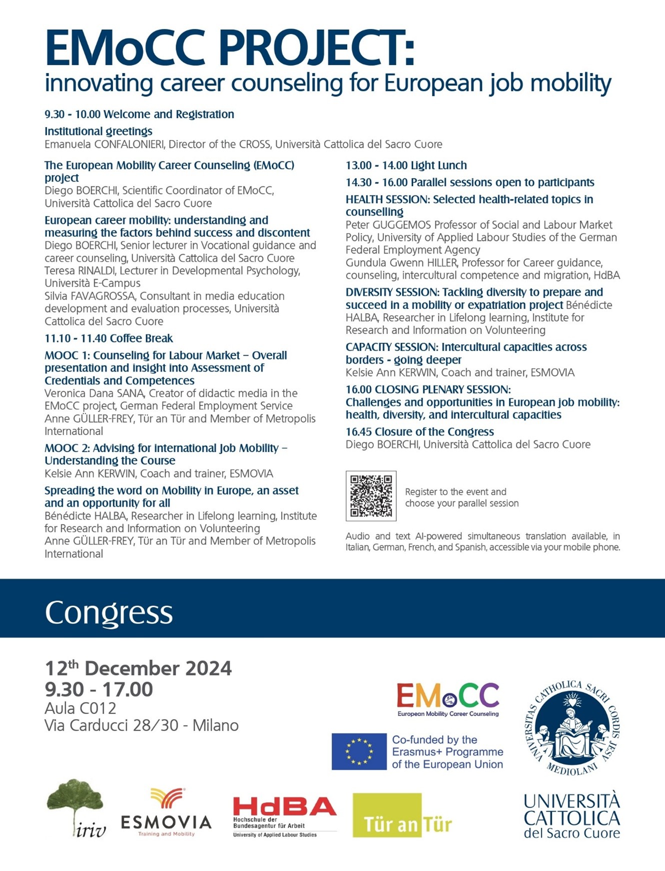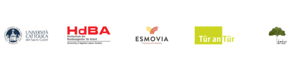 The EMoCC project was initiated and led by the Università Cattolica del Sacro Cuore (UCSC, Milano, Italy) together with the University of Applied Labour Studies Mannheim (HDBA, Mannheim Germany), an organisation specialising in youth mobility (ESMOVIA, Valencia, Spain), an organisation working for the social and professional inclusion of migrants and refugees (Tuer an Tuer, Augsburg, Germany) and the Institute for lifelong learning (iriv, Paris, France).